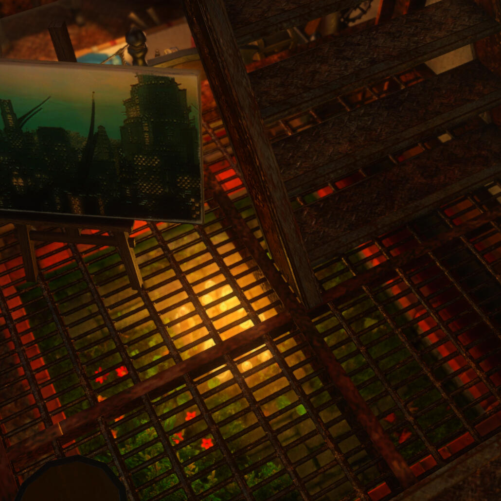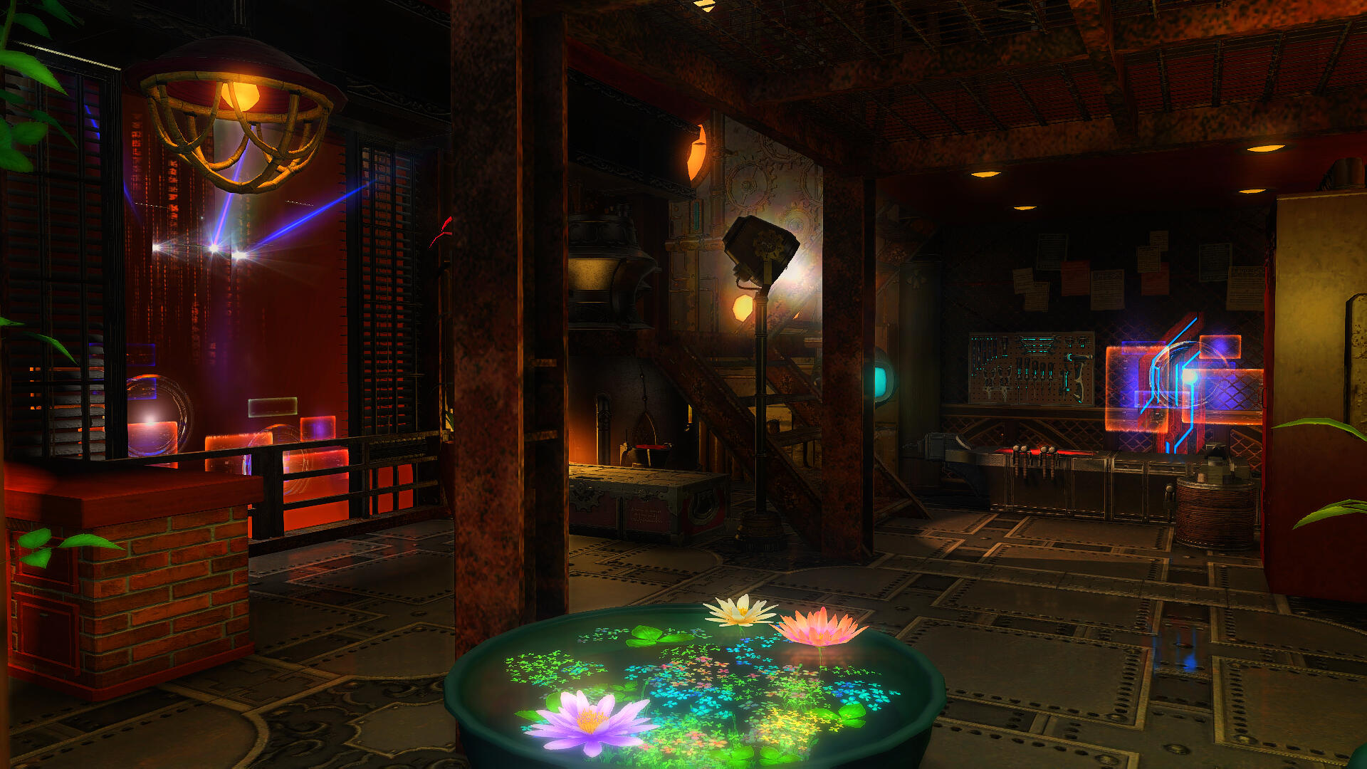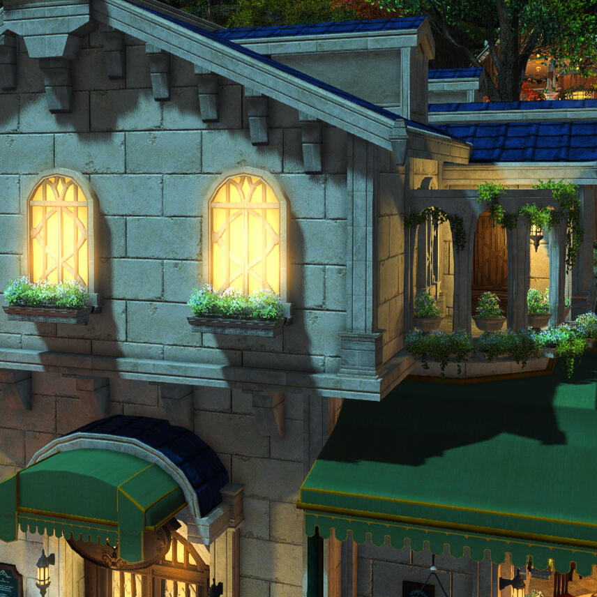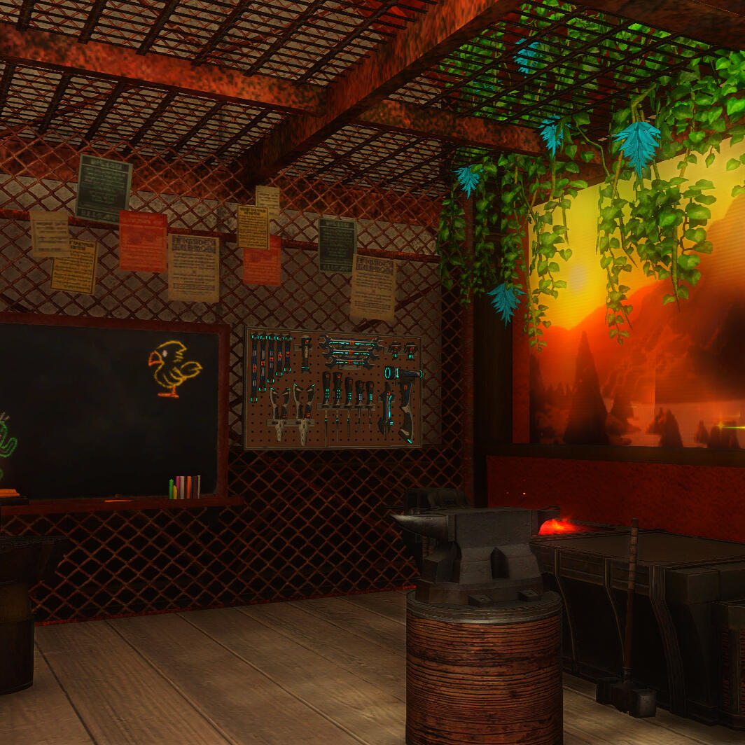 This crafting space takes advantage of various light effects to add visual interest to a zero-light setting.The showcase window utilizes shadows cast from overhead by a Azure Sky Phasmascape to create the contours of an urban skyline.From here, Queen's Rests, Allagan Terminals, and a Miniature Golden Saucer combine to create shifting layers of light evocative of a bustling city.The space features a crafting space, an artist's loft, and a small lounge and kitchenette.