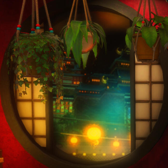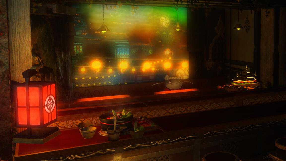 The lounge space features a false-depth Kugane cityscape, with a miniature aetheryte atop a stone bridge providing an evocative, if strictly inaccurate "view" of the plaza outside the Shiokaze Hostelry! I used a narrow rectangular frame to restrict the field of view here. Creating this alcove ate into my previous furnishing slot budget - having to frame every side of a showcase as opposed to only the top or bottom edge, or only the sides, for instance, as is more permissible with "natural" finishes.