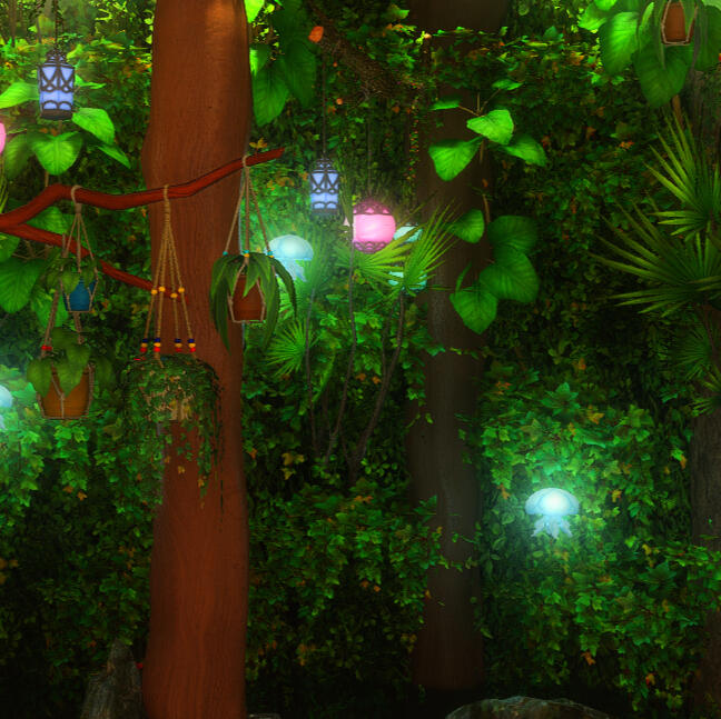 To the sides of a central open space with a seasonally-appropriate display (not pictured here) are the two defining features of this floor: the forest diorama, and the multi-level seating area.The forest utilizes Log Pillars, Verdant Pillars, Verdant Partitions, Field of Hope Rugs, an Eastern Indoor Pond, Ivy Pendant Wall Lights, and Hanging Planter Branches, dyed in a wide variety of colors to create the illusion of a densely-wooded thicket. Floating Jellyfish Lamps add depth and movement, while Azure Sky Phasmascapes add a dappled light filtering through the leaves below.The seating area is comprised of several Imitation Wooden Skylights, Portal Partions, and Spring Meadow Partitions floated from the basement level. Dawn light filters through an Urth's Fount Phasmascape and Gaol Partitions to make this a lovely place to spend a lazy morning watching people come and go!
