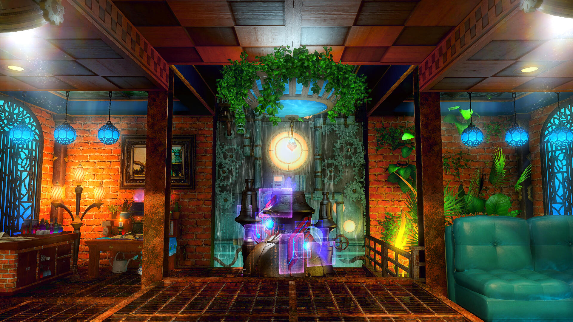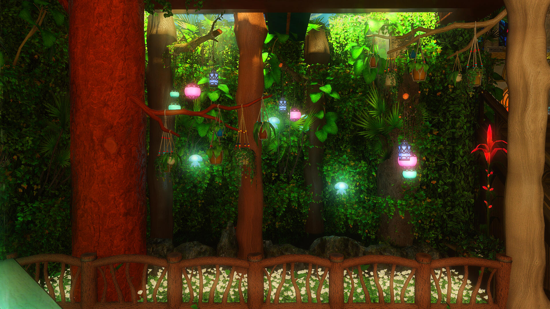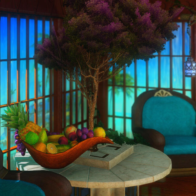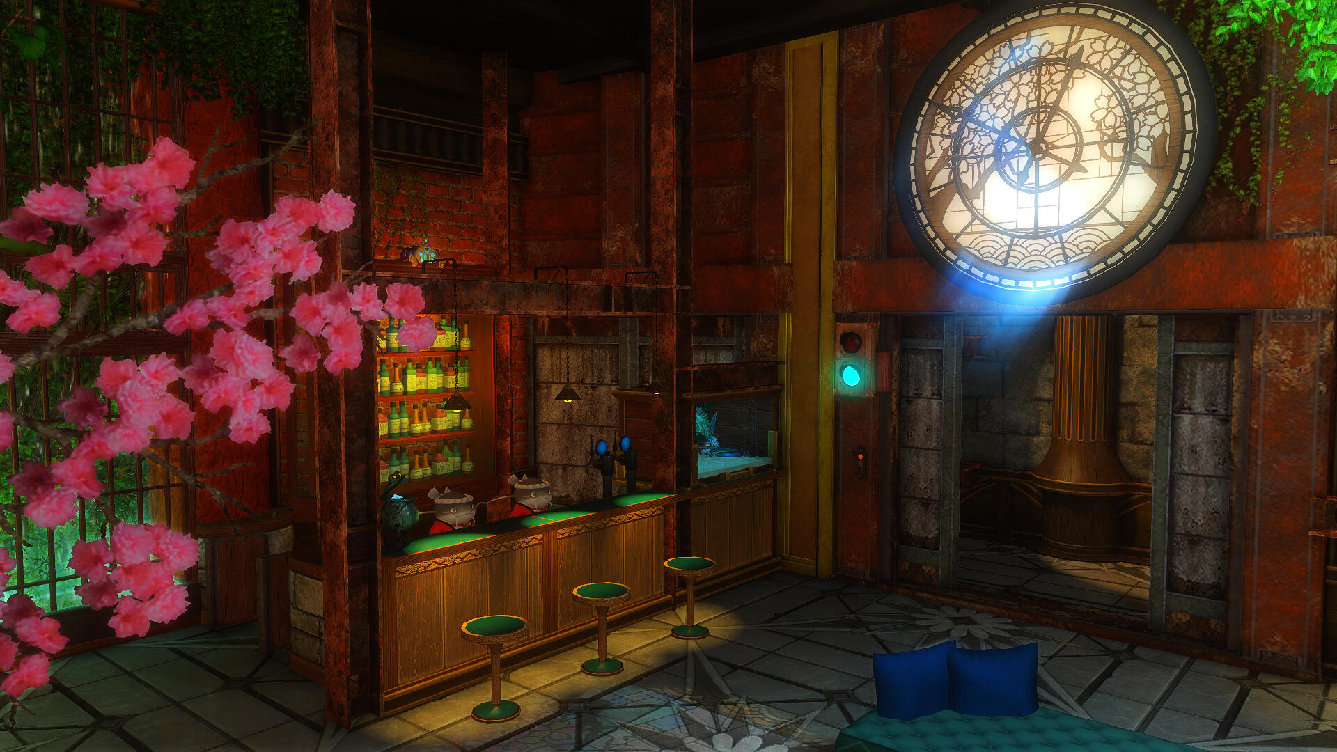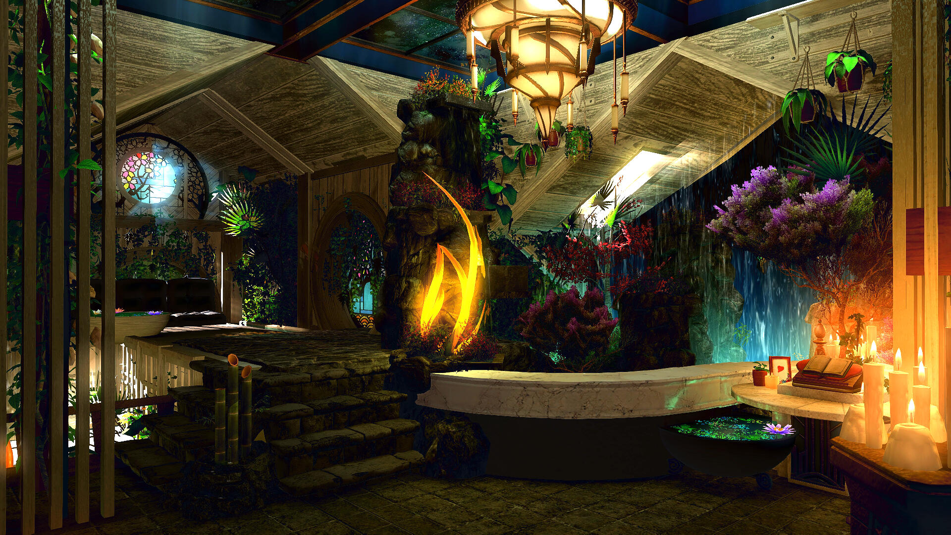 Upstairs, a library and lounge space is surrounded by illuminated rafters and showcase planted windowscapes.Adjoining this space is a greenhouse area, featuring a small pond and alchemy accessories. The natural lighting in this area is particularly detailed, with angled arched windowpanes reaching peak luminosity in sequence from east to northwest over the course of the day!