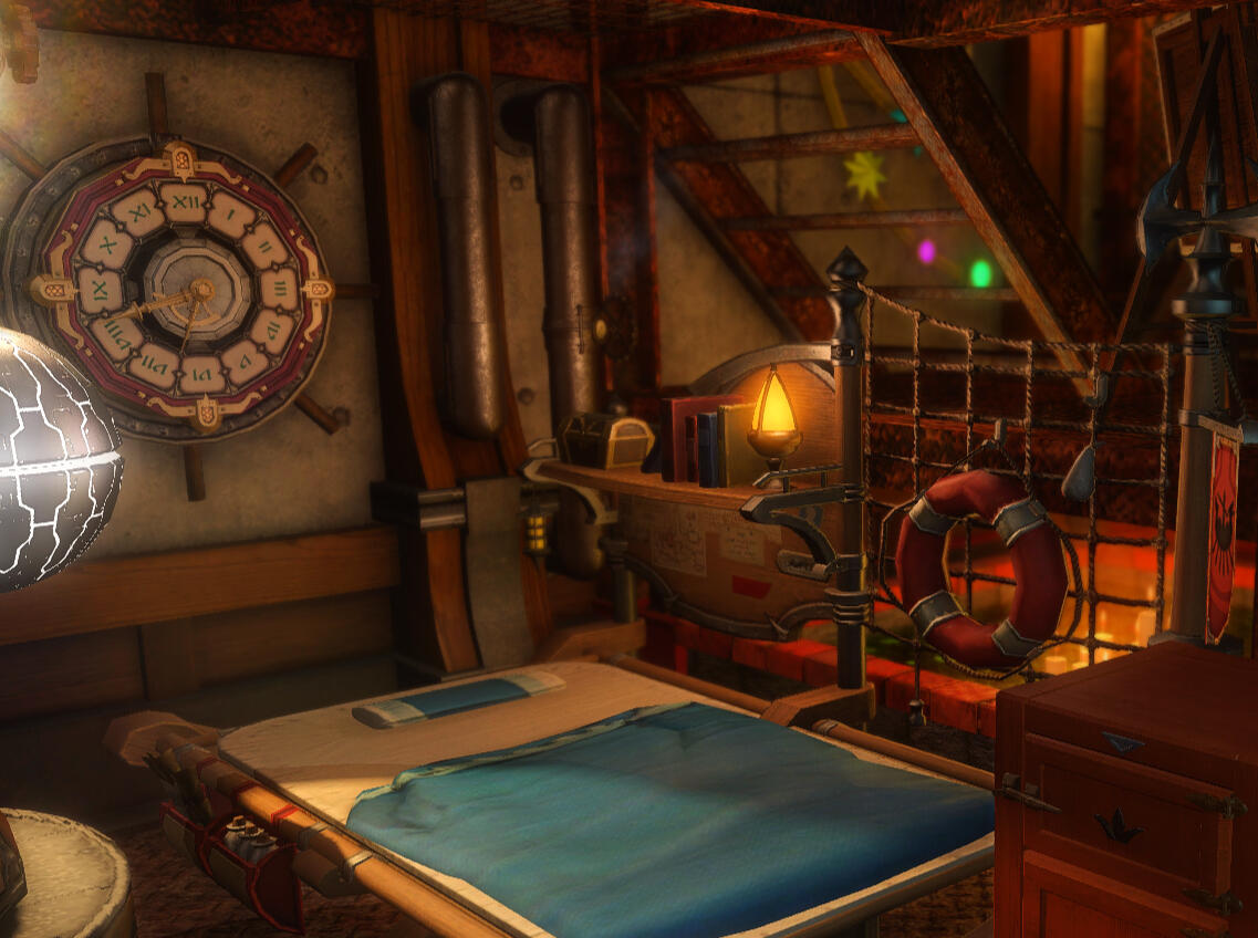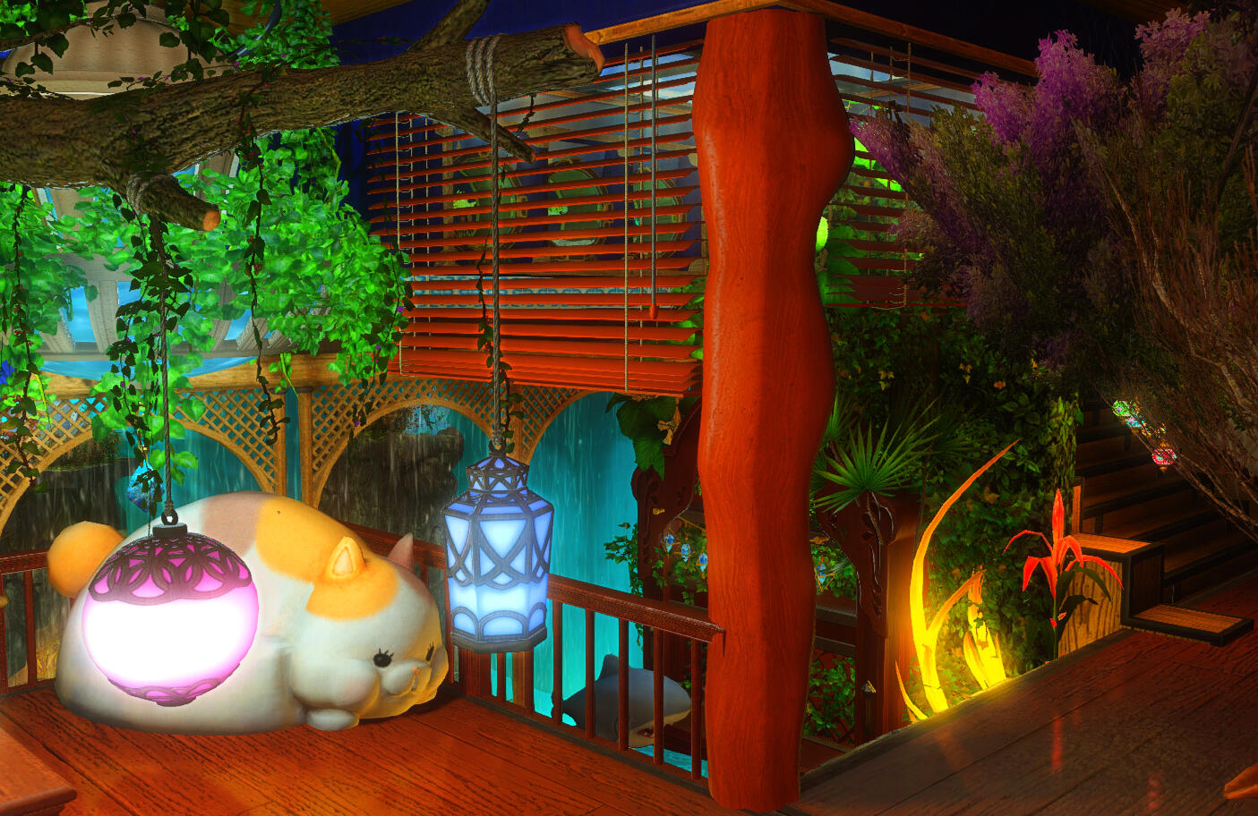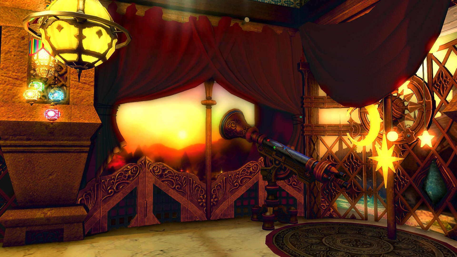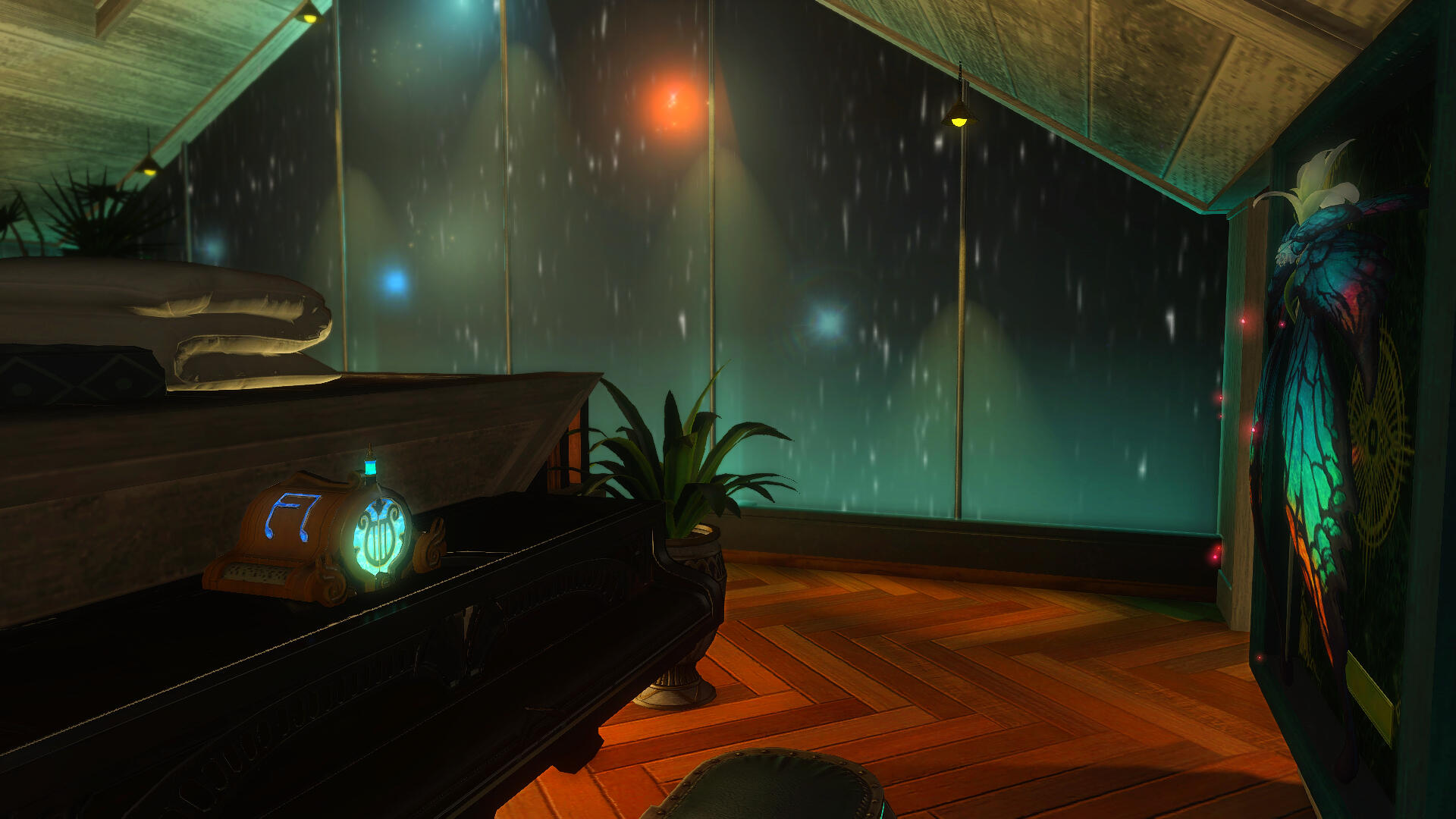 This variation on the window uses fewer slots on slats in order to maximize the feeling of an expansive night sky, hazy with light pollution and rain, but cozy nonetheless.Likewise, the shadowed balcony showcases the shifting laser beams from the base of the Miniature Golden Saucer item, giving the feeling of a city far below.Also utilized here is a pared-down version of Rem Rem's Open-View Wooden Fireplace underneath the bed, which through some careful placement, sleeps three!My favorite part of this build is how it transitions from nighttime to morning, with the dawn breaking through the stained glass panels and creeping down the bed, casting rainbow light across different textures!I feature this build as a background in Husky by the Geek's fantastic collaboration video for the 10th Anniversary of ARR!