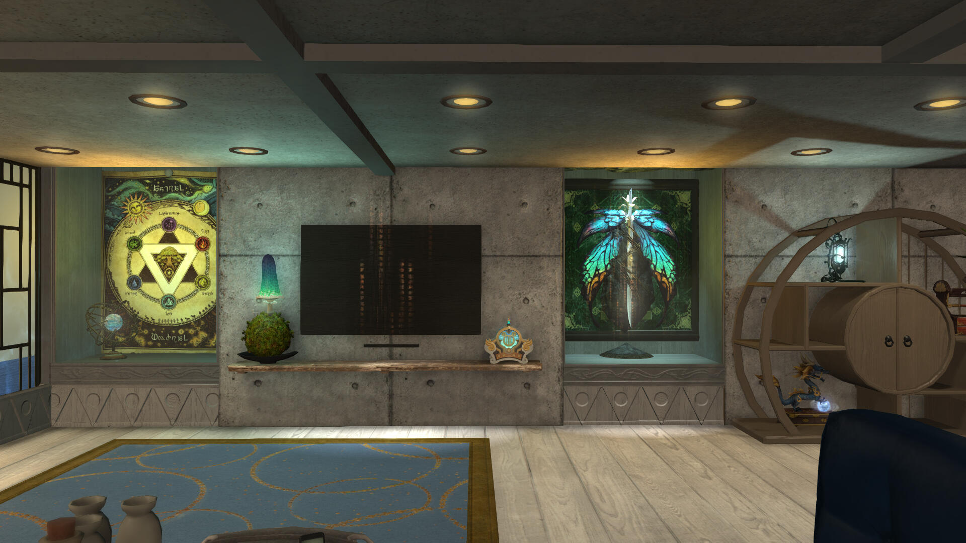 In this refresh of my FC's estate, I chose to streamline elements of the previous build, adding a stronger geometric visual language, and adding details to give each space its own identity.I consolidated the previous iteration's lounge and reception areas into a grand atrium, with high ceilings and angled window dressings emphasizing the verticality of the room up to the false skylight ceiling.At the center of the space, I implemented a classic "clock spots" arrangement in tank, healer, and DPS colors, a fun nod to endgame raiding and the standard 8-man party composition!