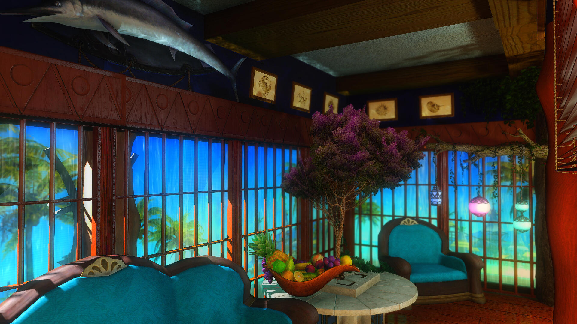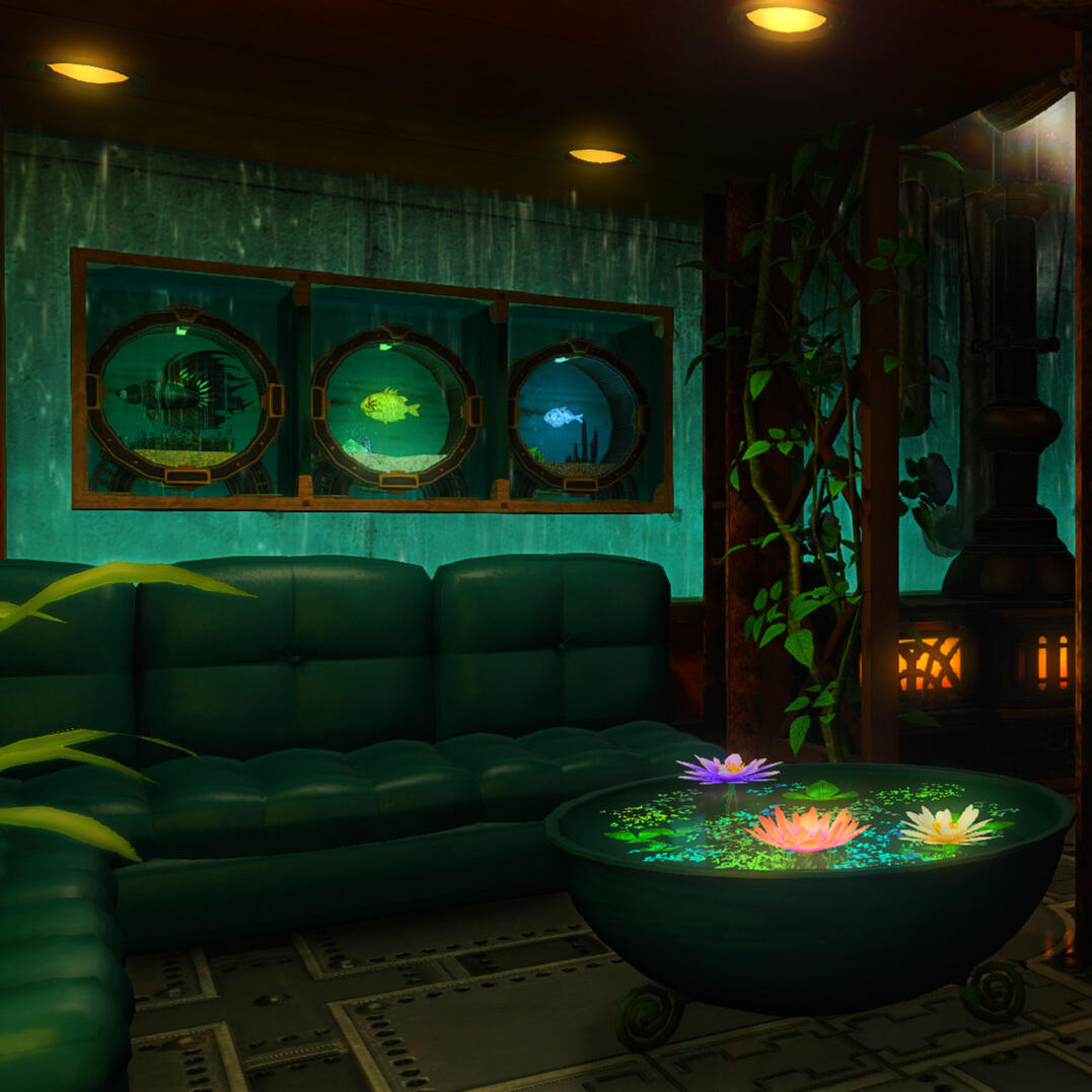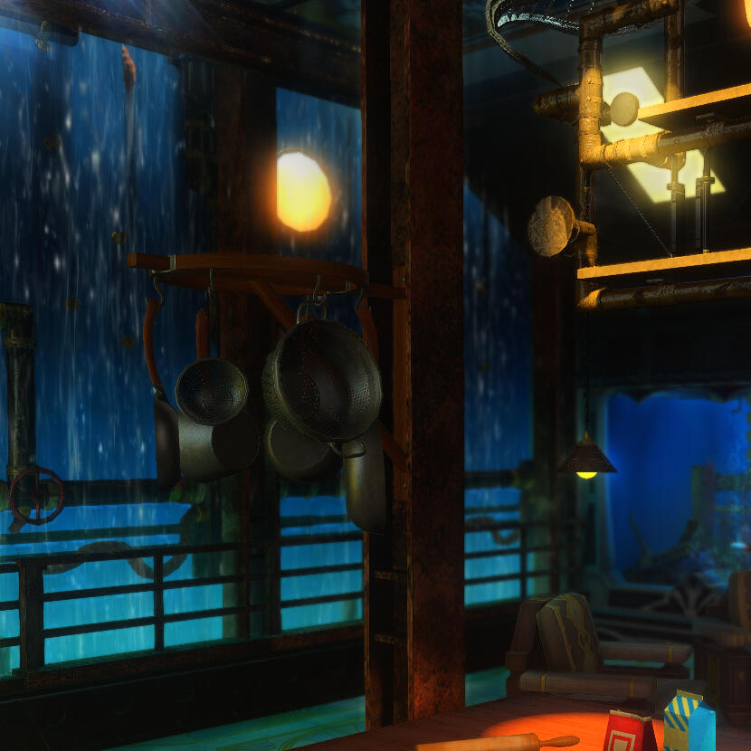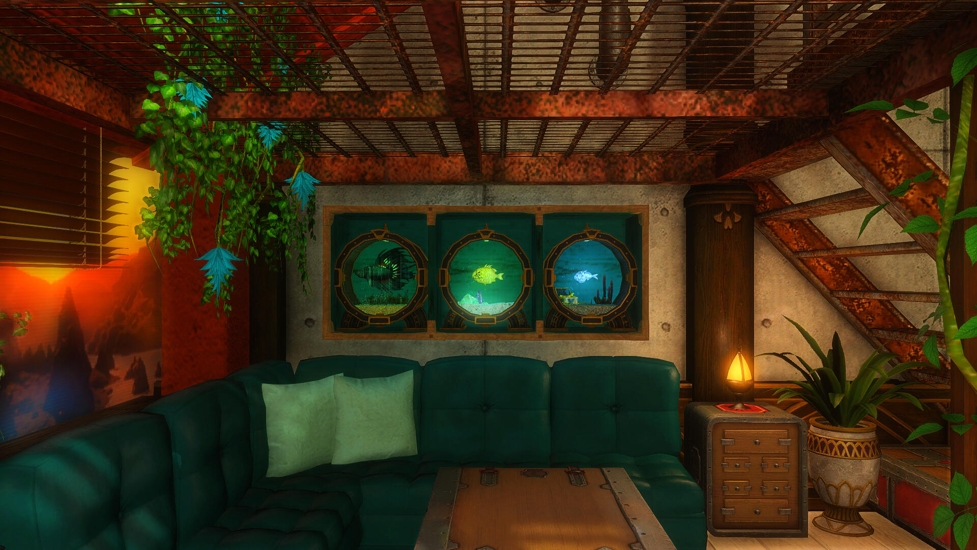 The porthole, adapted from a design I first utilized in Shelter Below provides a nice visual focal point for the kitchen area, with fish swimming in front of it and creating a constantly-shifting view.Not pictured here are the "filler windows", which use Crystarium wardrobes paired with Mahogany Aqueducts to make a lovely aquatic effect in an art-deco/Amaurotine frame.The room is anchored by the deviously clever window presented by Kyapuchun Housing, which uses Azure Sky Phasmascapes to cast shadows from the protruding pieces of Enigma Partitions.