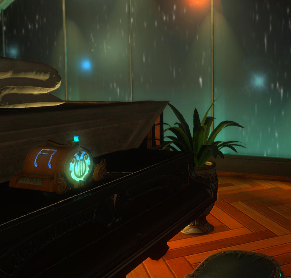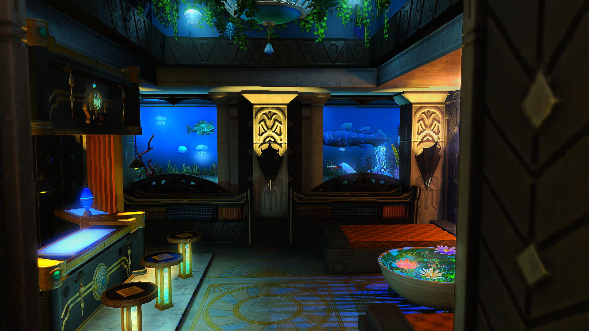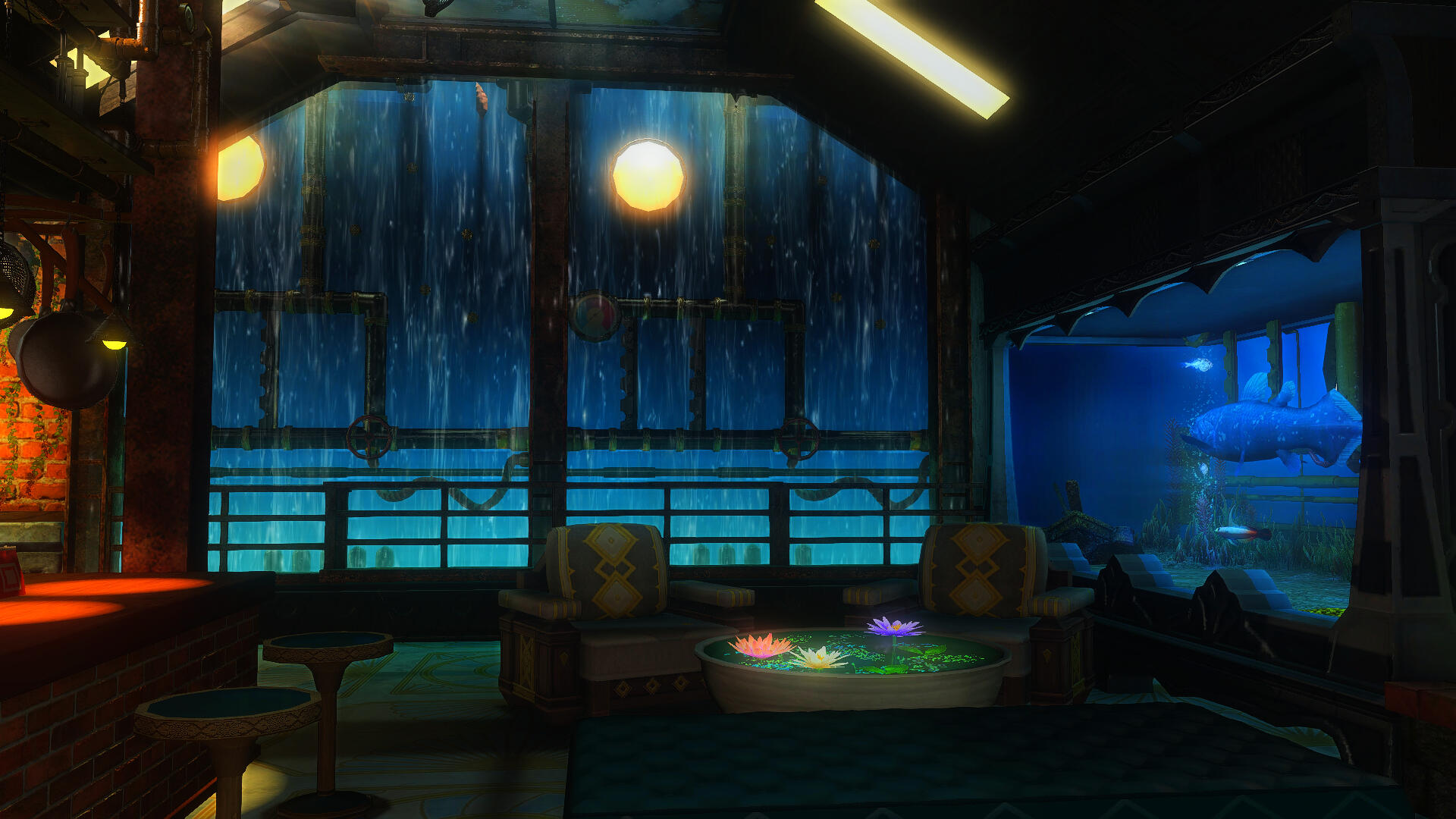 The porthole, adapted from a design I first utilized in Shelter Below provides a nice visual focal point for the kitchen area, with fish swimming in front of it and creating a constantly-shifting view.Not pictured here are the "filler windows", which use Crystarium wardrobes paired with Mahogany Aqueducts to make a lovely aquatic effect in an art-deco/Amaurotine frame.The room is anchored by the deviously clever window presented by Kyapuchun Housing, which uses Azure Sky Phasmascapes to cast shadows from the protruding pieces of Enigma Partitions.