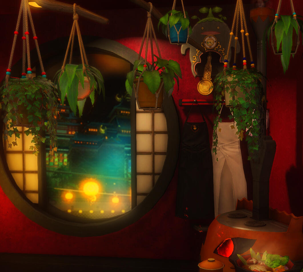 "One more meal before the sky burns down..."This build represents a meeting of Eastern and Amaurotine aesthetics in an elegant industrial lounge space.The seating area sits above an Eastern Indoor Pond lit by Assorted Candles, sitting on top of wooden slats comprised of Antique Wooden Shelves.Originally, I had utilized Ashen Bride's "Cityscape Window" as featured on the HGXIV youtube channel as the focal point of the build (pictured below), but found that I wasn't blown away by the overall effect.