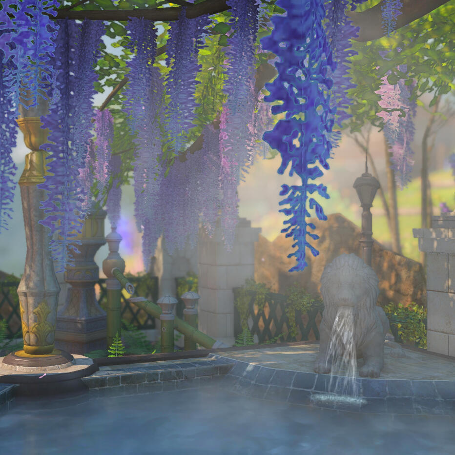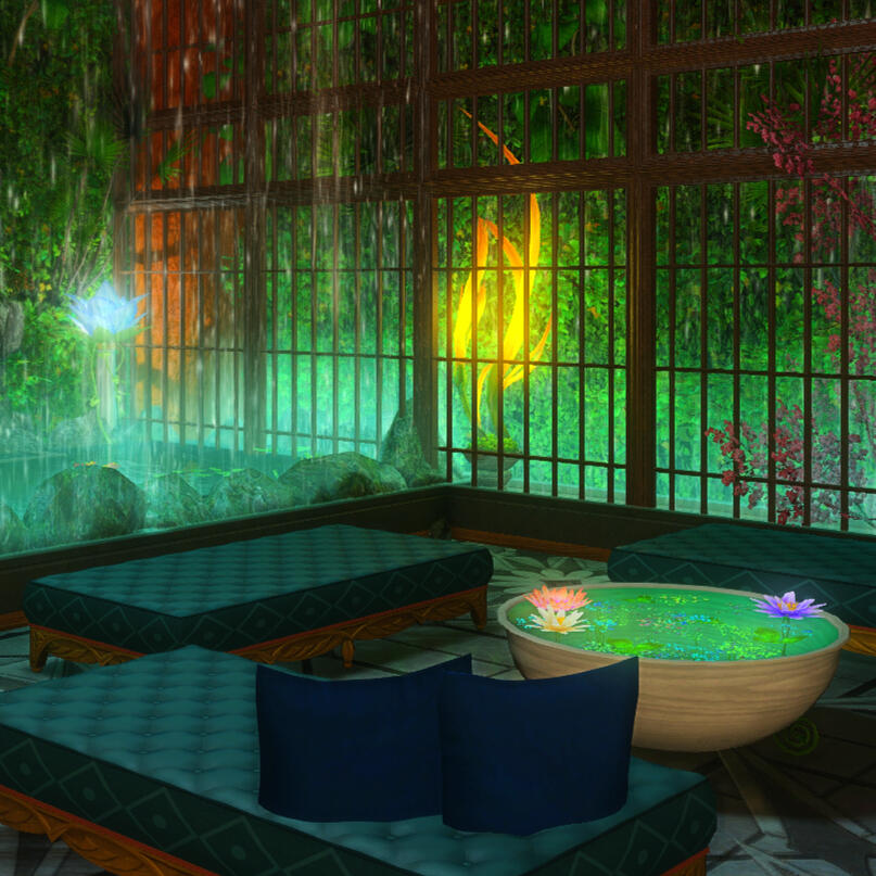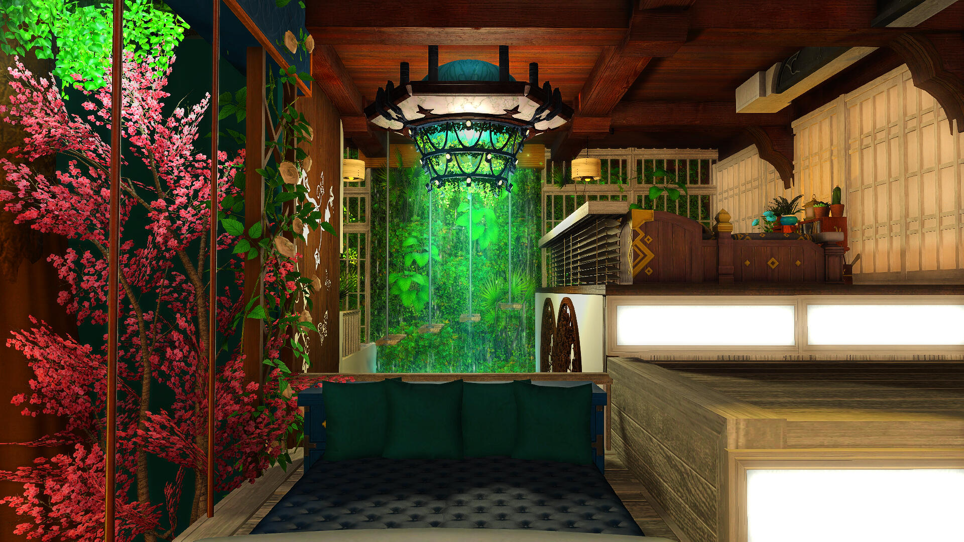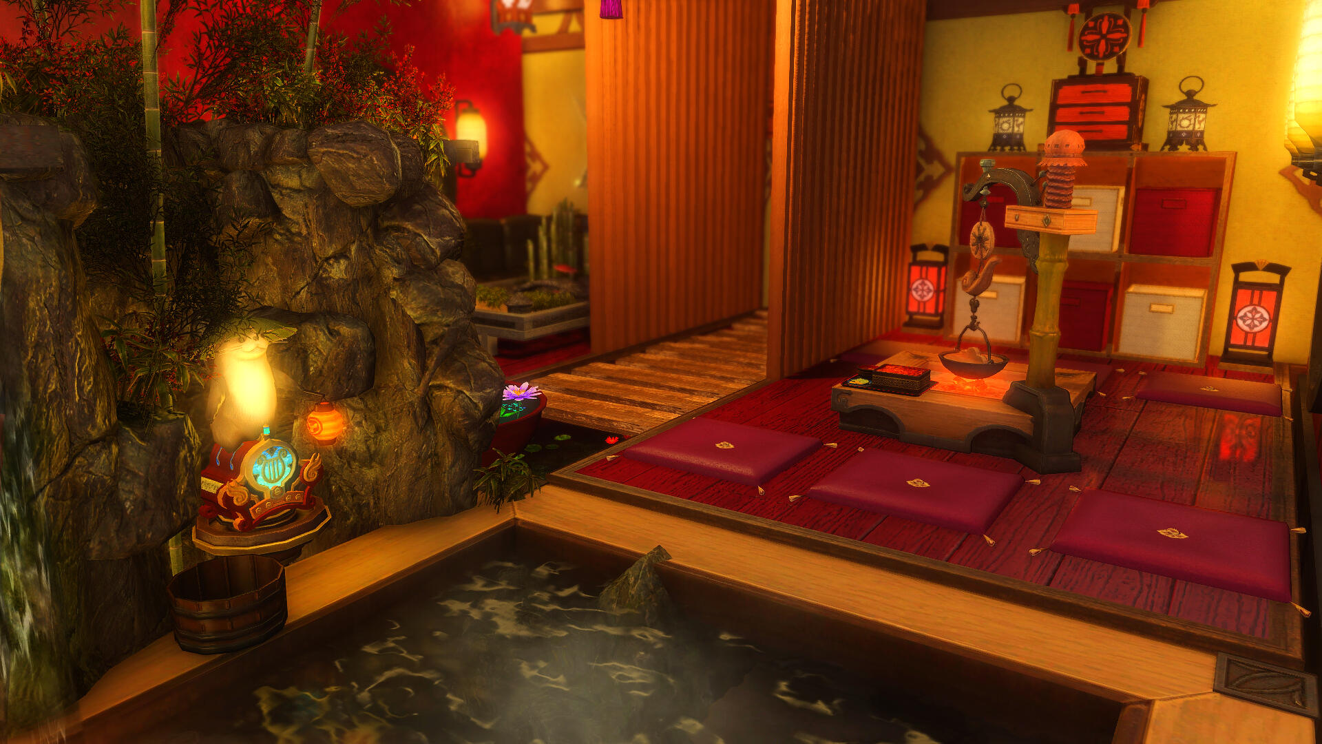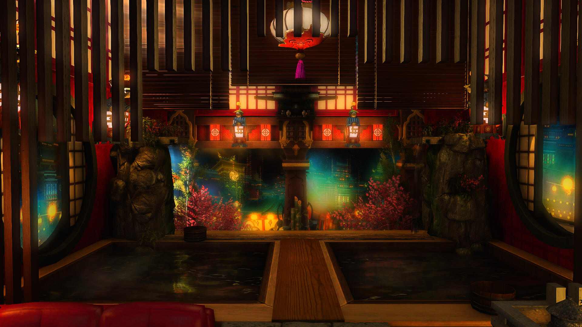 This renovation of my older onsen build divides the space into three zones for a better sense of balance and depth.The entryway features a small sitting area and miniature garden showpiece. I floated Wood Slat Partitions and Wooden Blinds in a staggered symmetrical pattern to draw the eye upward.On the other side of the two tubs, I created a facsimile sand garden using the striations on the Moogle Rug and Combed Wool Rug floor items. Finally, two Queen's Rests create a visually dynamic pattern over the Kugane Phasmascape background.