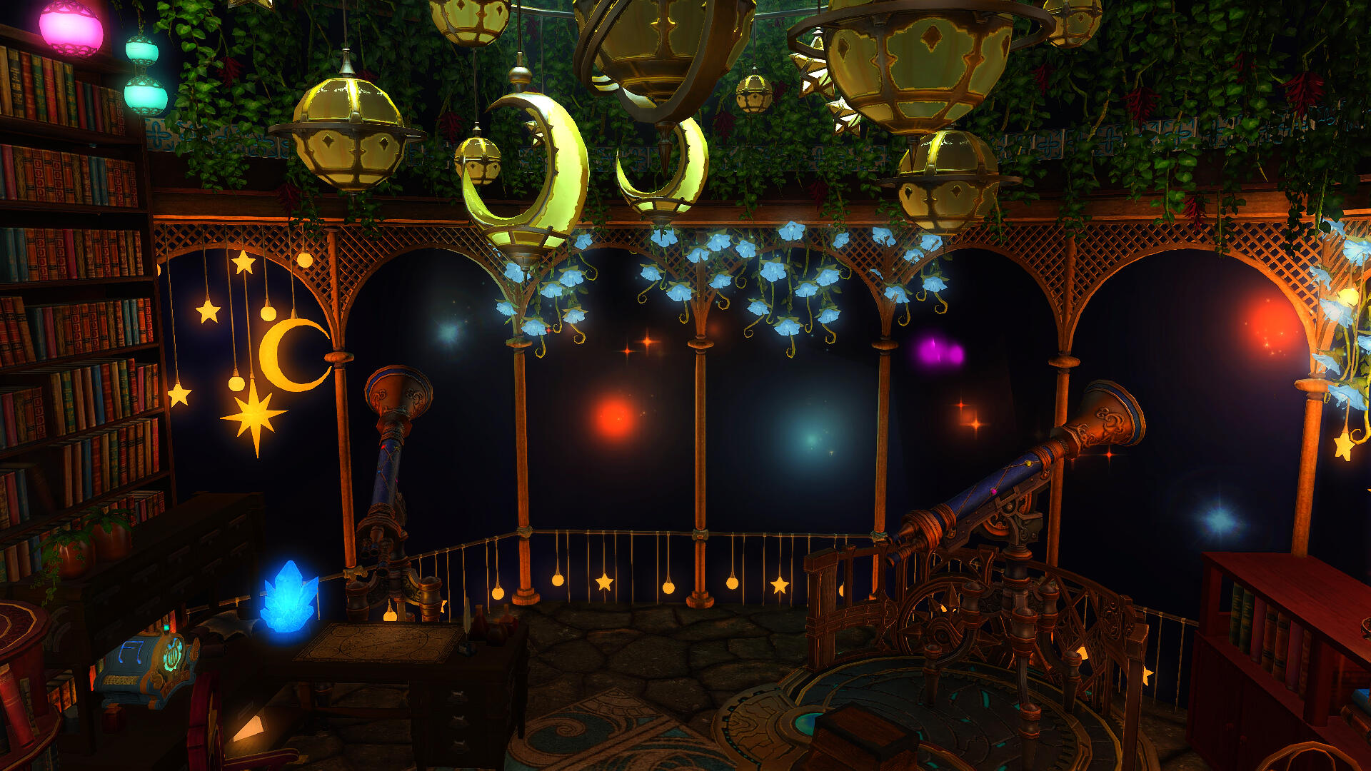This build attempts to get at an answer to that question. A frankly impractical number of items have been floated behind the night sky panels in order to create a diverse set of stars for the aspiring astronomer to chart.I've included a two desks, one skewing towards the astronomical, and the other the thaumaturgic. After Endwalker, the idea of the stars being a place for botanists and alchemists to source materials and practice their craft has become all the more plausible!The entryway and hearth area are defined by the use of masonwork and raw stone, as well as crystal glass accents to anchor an Ishgardian feel.