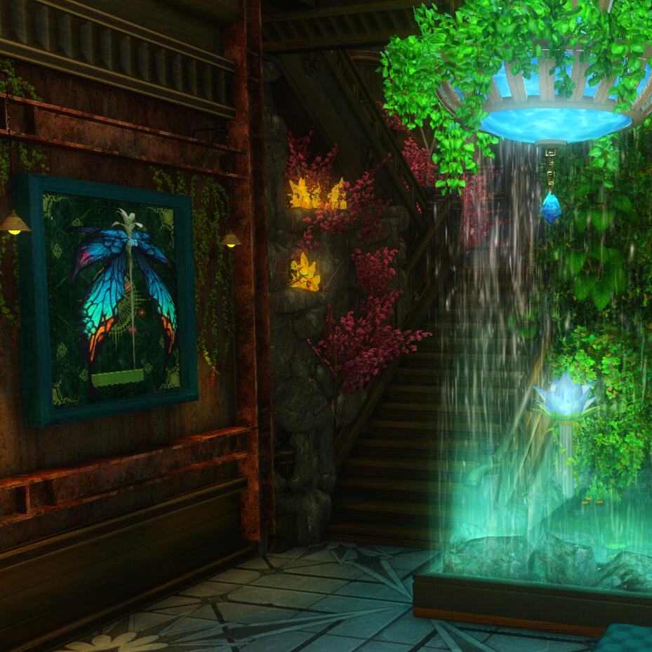 For this build, I wanted the staircase itself to be worthy of attention, and to that end, I installed an elaborate pond fishtank, using Verdant Partitions, an Urth's Fount Phasmascape, and two Flagstone Lofts to completely hide the natural wooden walls of the tank.Directly opposite the tank, leading down into the basement proper is a rocky wall overgrowing with pink foliage and crystals. I filled the space under the staircase using four Indoor Oriental Waterfalls to create an uneven surface with niches in which to set the Golden Crystal Boules.One day, Yoshi-P will descend from the heavens, give us a gentle kiss on the forehead, and finally put an actual rough stone partition into the game. It seems like a huge oversight, and requires designers to burn slots on waterfalls to approximate that texture. But I digress...