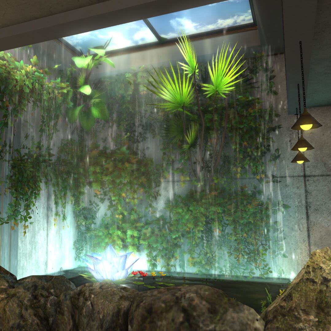 The showcase pond connects to the first of several lounging areas. This one in particular features a greenhouse feel, with crystal glass overgrown with vegetation and an aqueduct casting ripple effects up the marble steps downward.