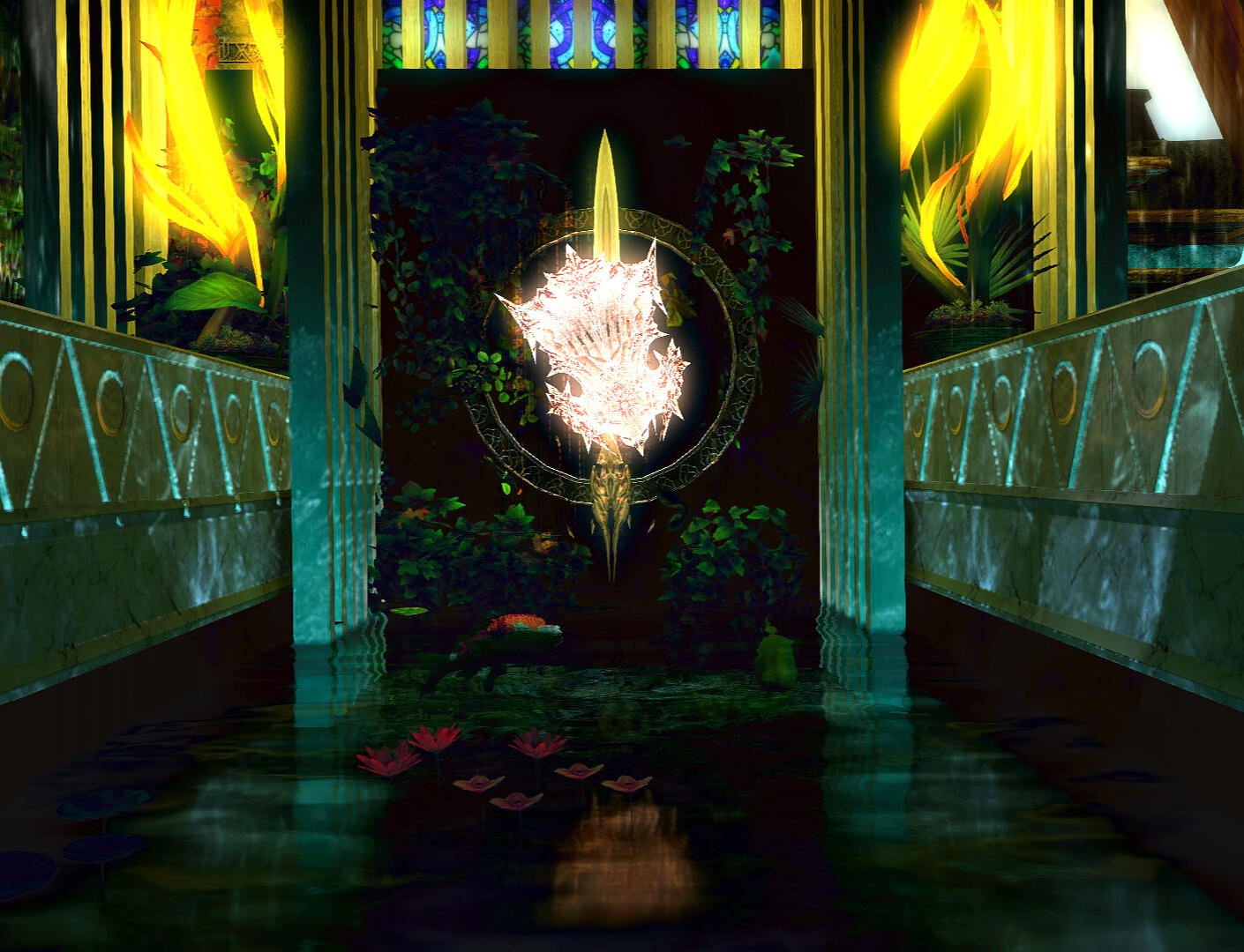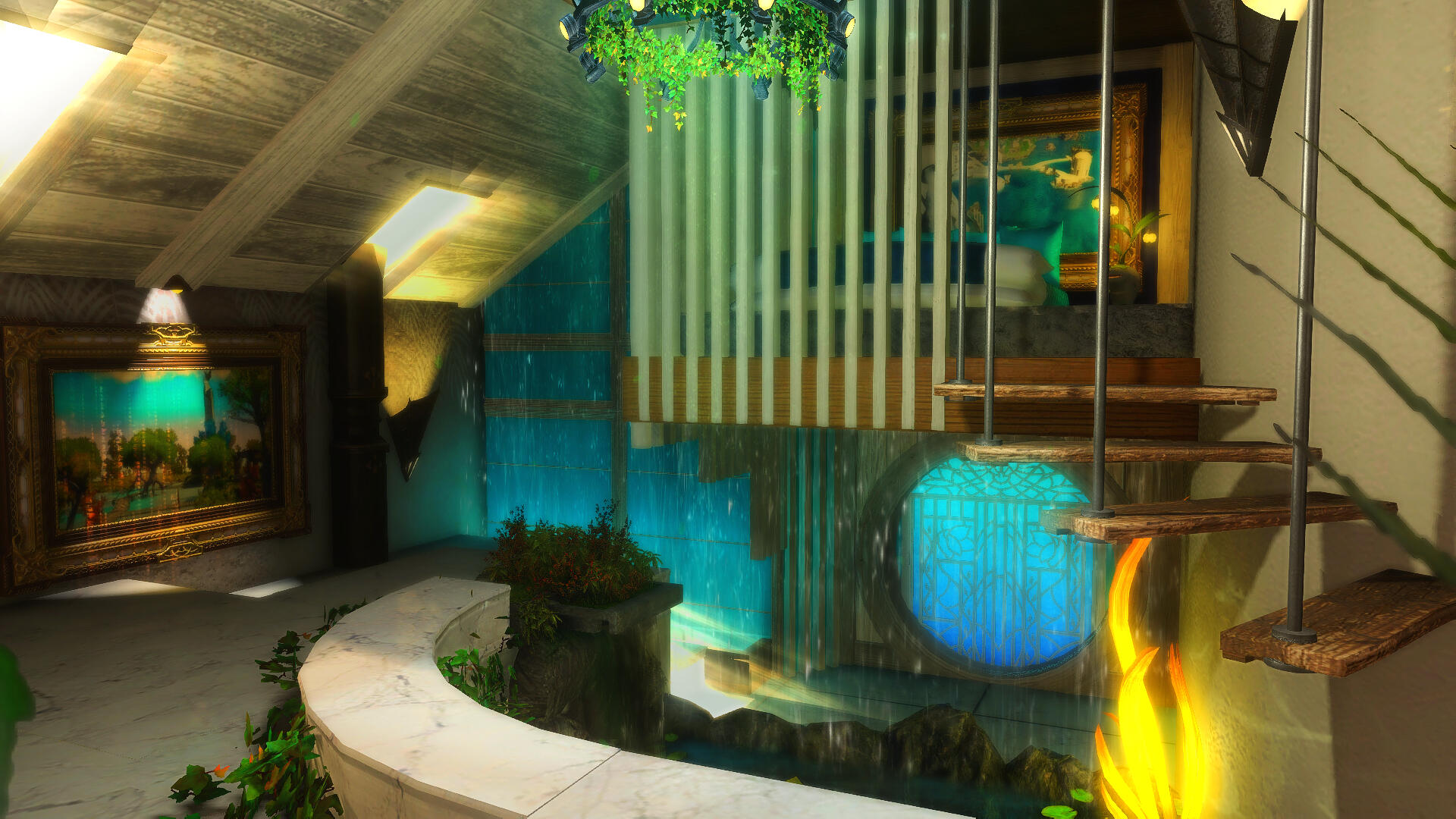 "Welcome to Osha's Attic!"Revised in the leadup to Dawntrail as a way to revisit some familiar aesthetics with more polish!The general inspiration for this build was symmetry and balance. Once the outer framework of the "attic" was in place, I centered the room on the "sword oath" motif above a reflecting pool.
