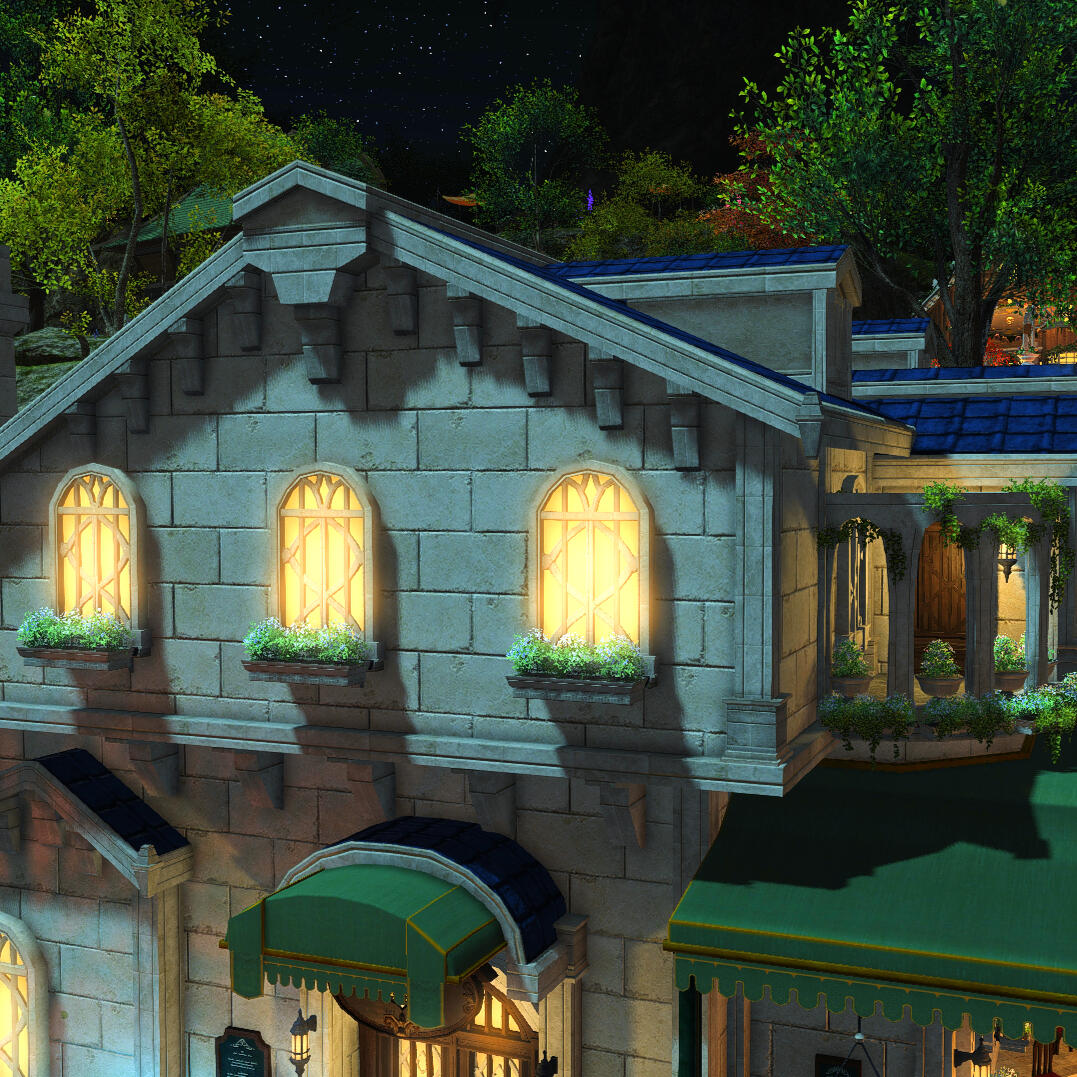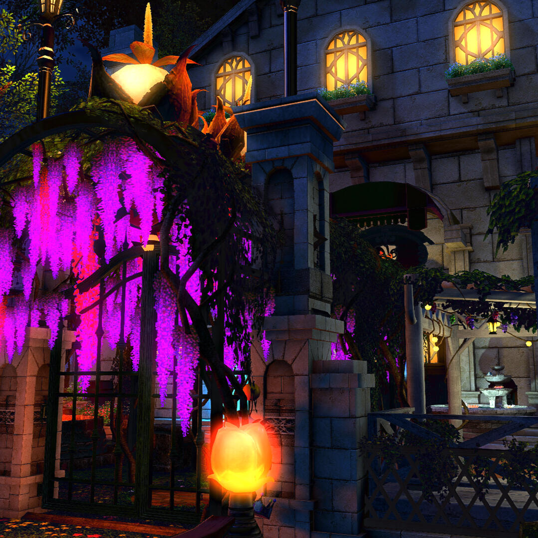 Lots of trees and communal gathering spaces bring a mix of Gridanian and Ishgardian aesthetics into play!Situated in the middle of the housing district, this estate utilizes the natural cliffs directly adjacent to the plot, as well as judicious placement of draping trees and awnings to create a sense of tranquil privacy.
