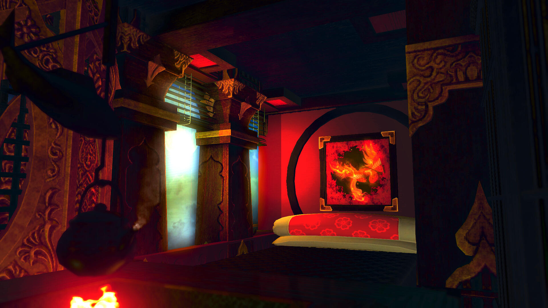 The onsen space begins with a long, vertical approach hallway, utilizing a skylight, decorative altar, and geometric woodwork to show off the full height of the apartment. I love the way the moonlight filters through the bamboo, eventually being replaced by cozy candlelight!The onsen space itself however, reduces that scale to the intimate immediately, forcing the camera lower by virtue of being under a loft, but also by the proportionally deep windowscape, a continuation of the lounge setup.In general, I think this build reflects the attitude that it's often best to lean into the constraints imposed on a creative project! I like to think the use of detail successfully gives each zone its own natural identity and sense of scale, even within a relatively short and narrow space.
