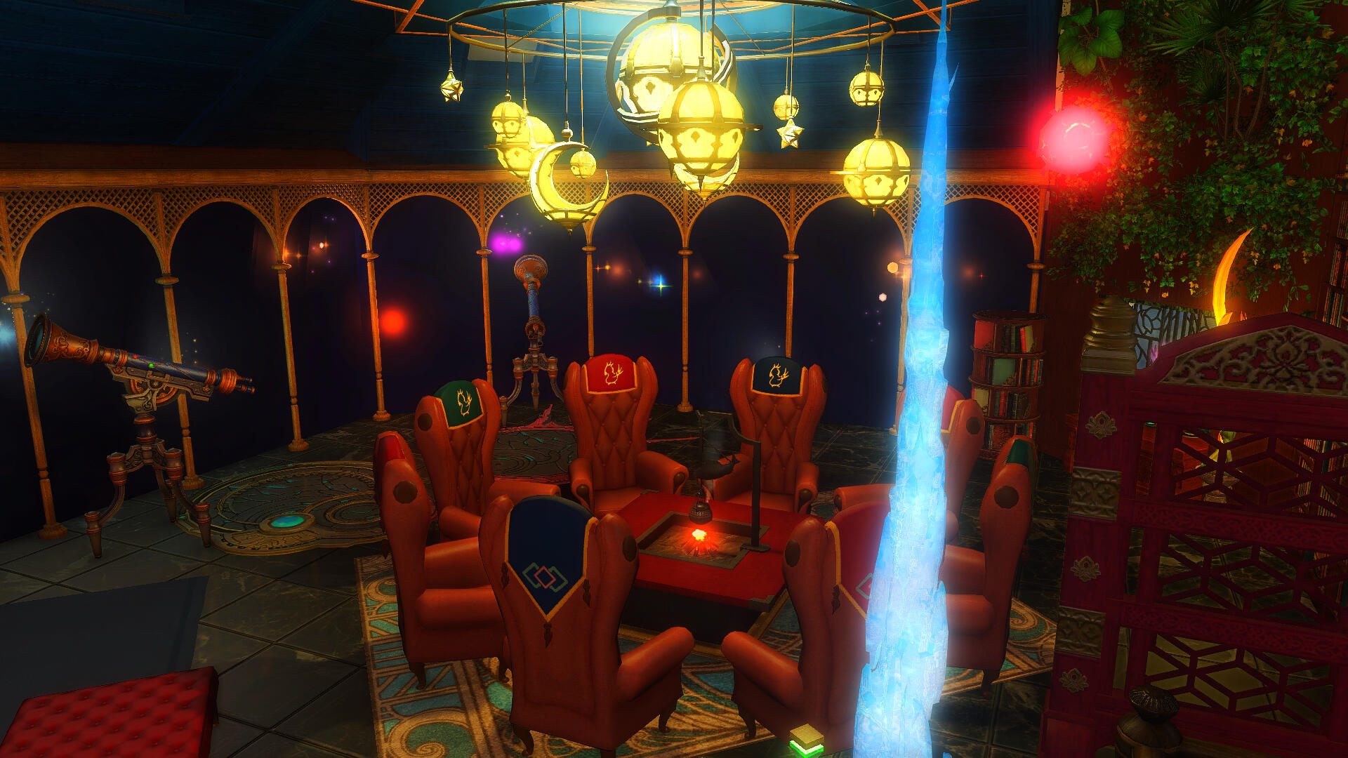To contrast the industrial-meets-forest-floor aesthetic of the basement, this floor is much closer to a fantasy setting in its conception.A small balcony overlooks a stained crystal tryptych on the staircase from the first floor. At the top of the stairs is a seating area featuring the Crystal Tower, as well as enough seating for your standard raiding static! The observant will notice the pattern of the chairs here mirrors clock spots for many different encounters (though I was basing mine explicitly on the spots from P1S!).Spanning about 180 degrees is an expansive night sky illusion wall, with every type of glow effect I could possibly think of making an appearance. Mellow Mog Lamps and Markworthy Mogsofas are particularly nice for creating double-planet illusions and have a beautiful pink sparkle!