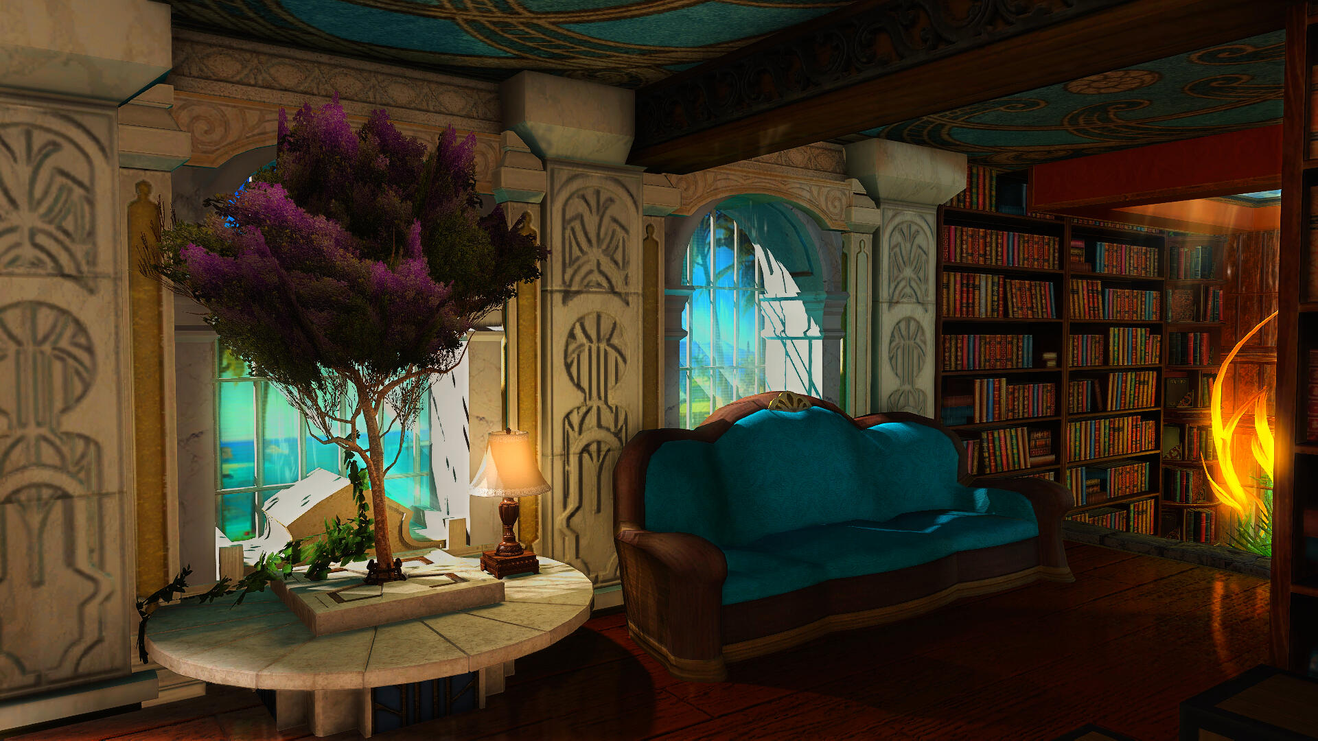 Upstairs, a library and lounge space is surrounded by illuminated rafters and showcase planted windowscapes.Adjoining this space is a greenhouse area, featuring a small pond and alchemy accessories. The natural lighting in this area is particularly detailed, with angled arched windowpanes reaching peak luminosity in sequence from east to northwest over the course of the day!